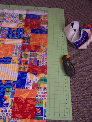 I trimmed my quilt starting with the bottom and the right side. I rotated the quilt around though because my living room is teeny tiny and I was having trouble maneuvering. So don't get confused in the next picture!